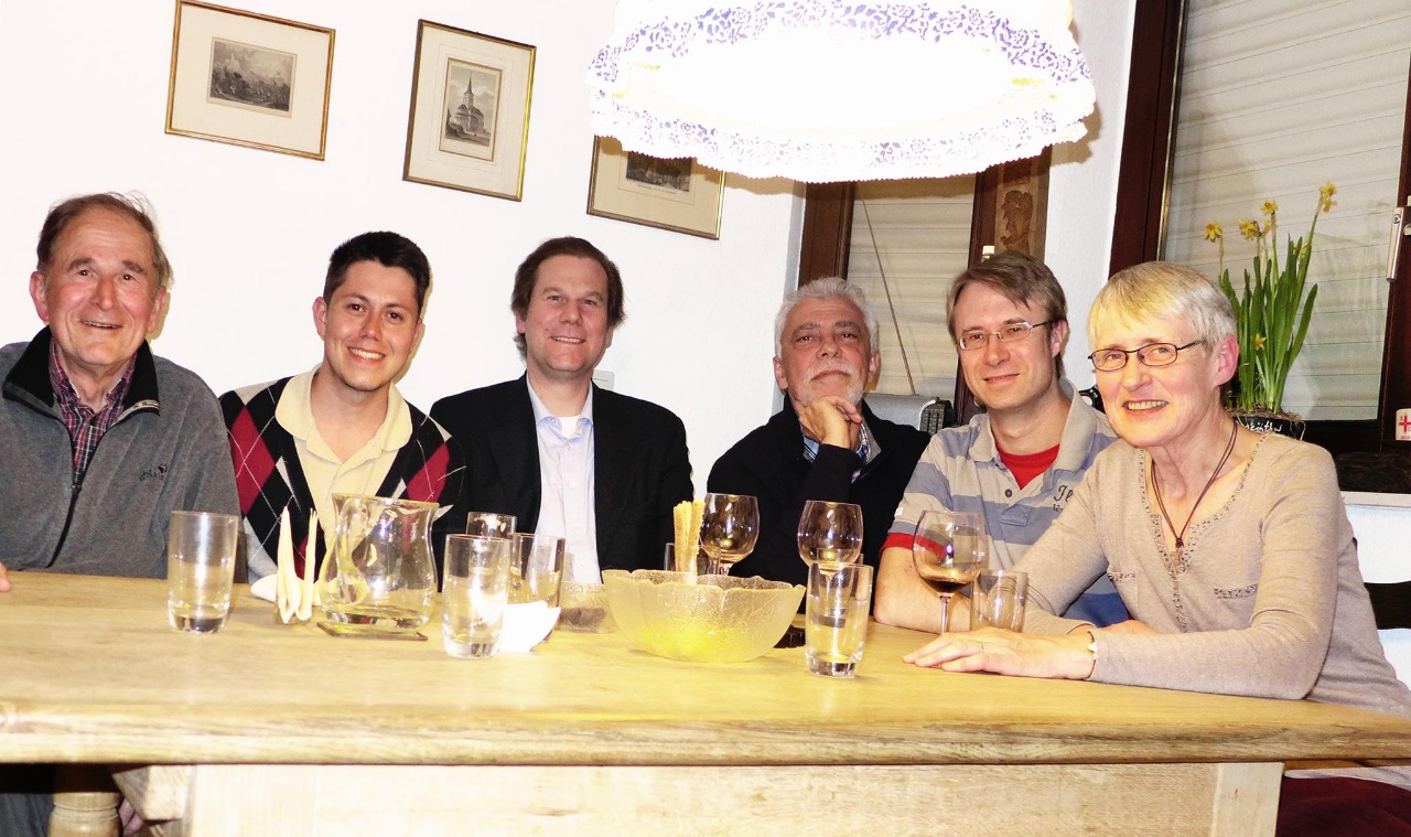 Poiso livro falava de morte, acidente em avião… disse muito obrigado e sai imediatamente da loja. Tinha voo no outro dia… e não ia levar o livro comigo! Já chegando próximo do meu retorno, em um jantar estiveram pessoas que viajaram de outras partes daAlemanha para estarem ali, como aparecem na foto. Entre todos estava o José Facion para me traduzir um pouco das conversações em alemão, e o filho deles que sabe espanhol.